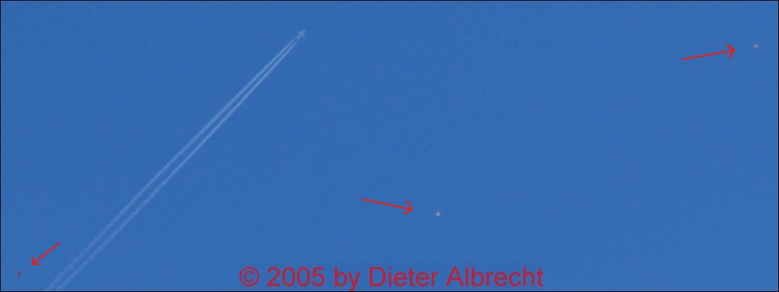 zu sehen. Sie bewegen sich in gleicher Richtung wie der Jet (wohl ein Airbus A-320), fast parallel dazu.